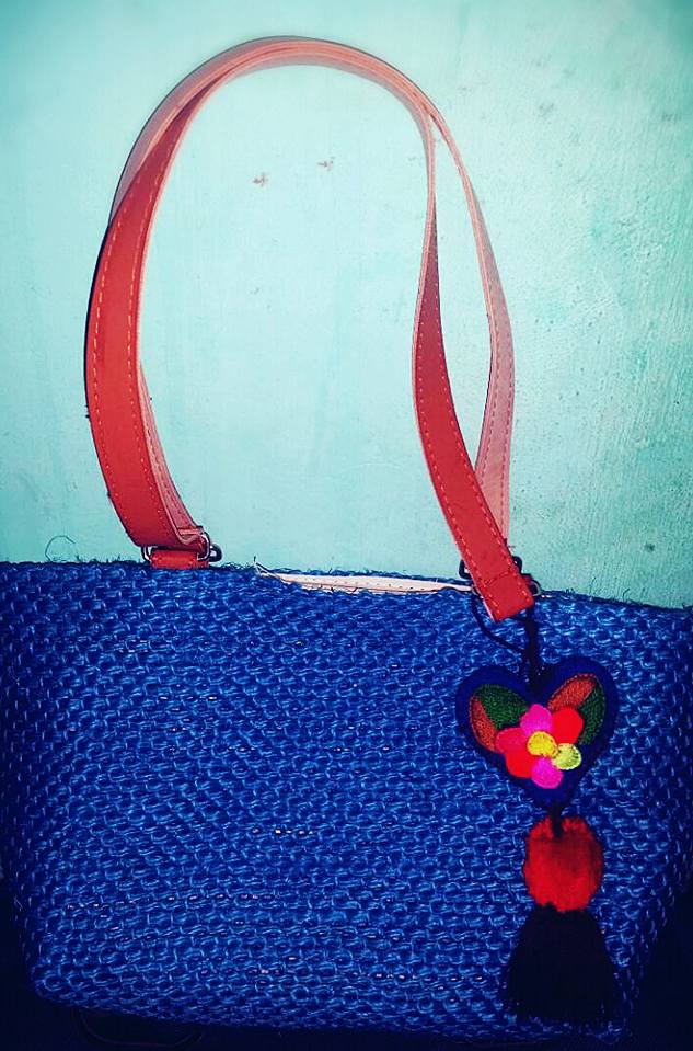 Bolso hecho con fibra de Henequen , asa sintetica y cierre de seguridad. Hecho a mano. Pompon de la colección colores de chiapas.